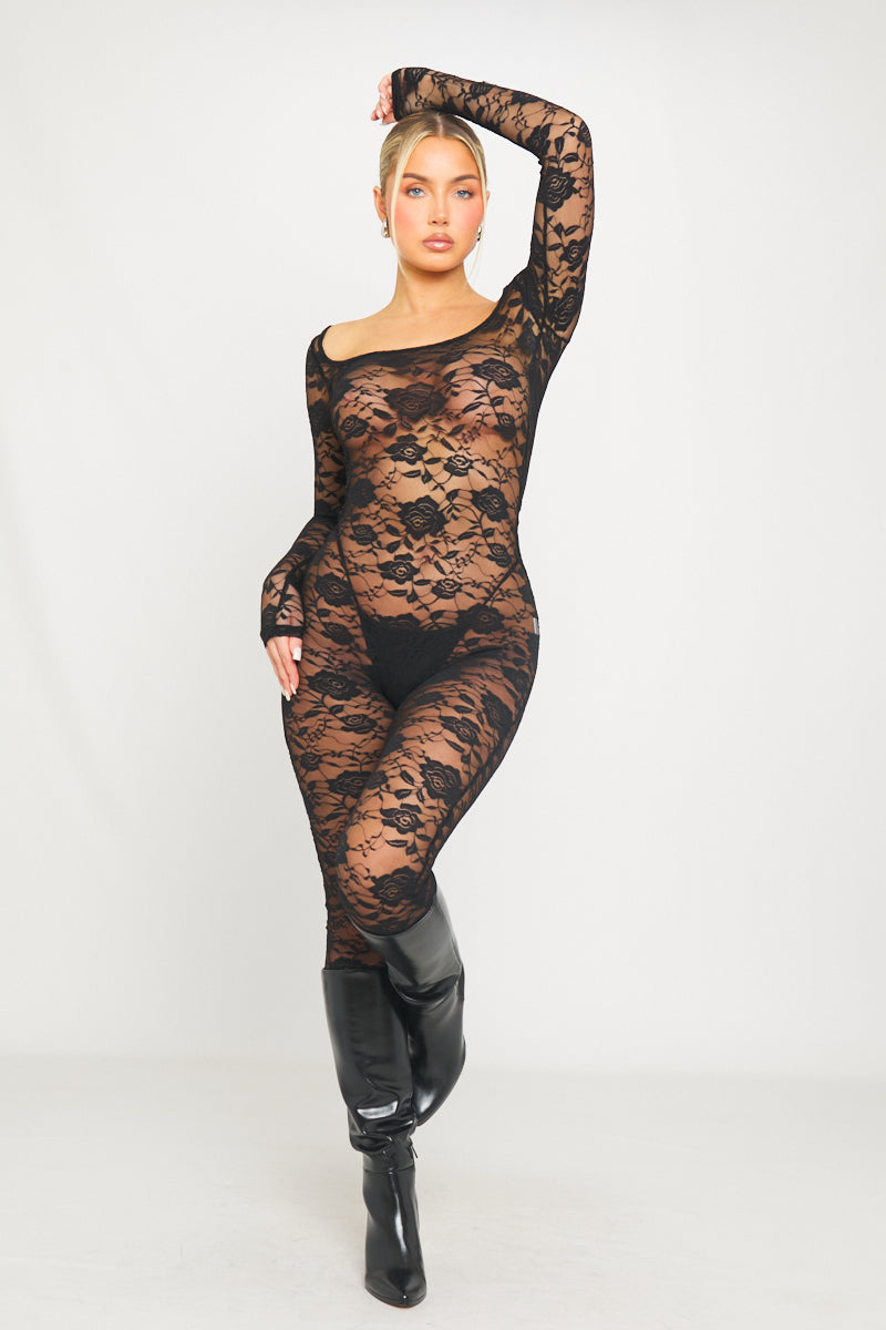 Black Lace Round Neck Long Sleeve Jumpsuit Catsuit