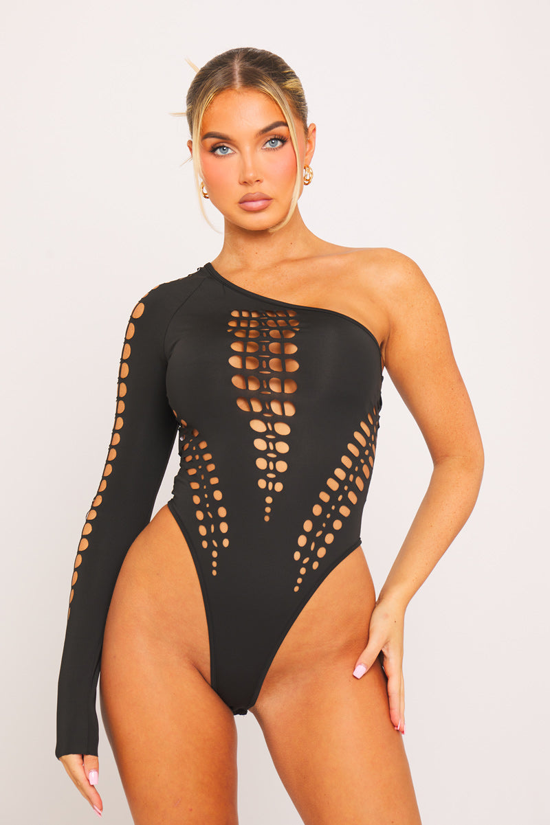 Black Multi Cut Out One Shoulder Asymmetrical Bodysuit