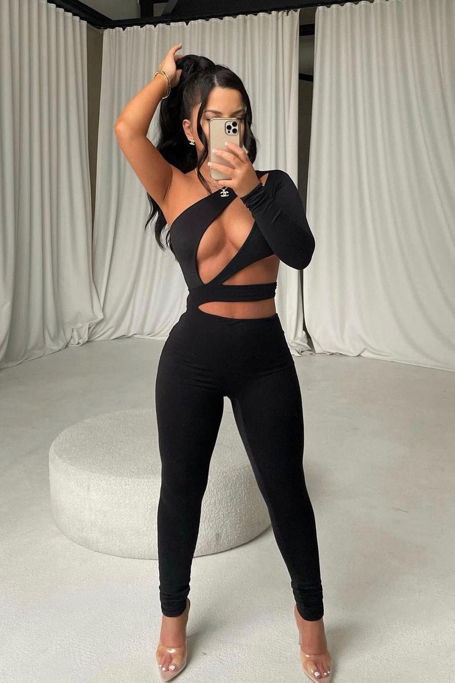Black One Shoulder Asymmetric Cut Out Jumpsuit