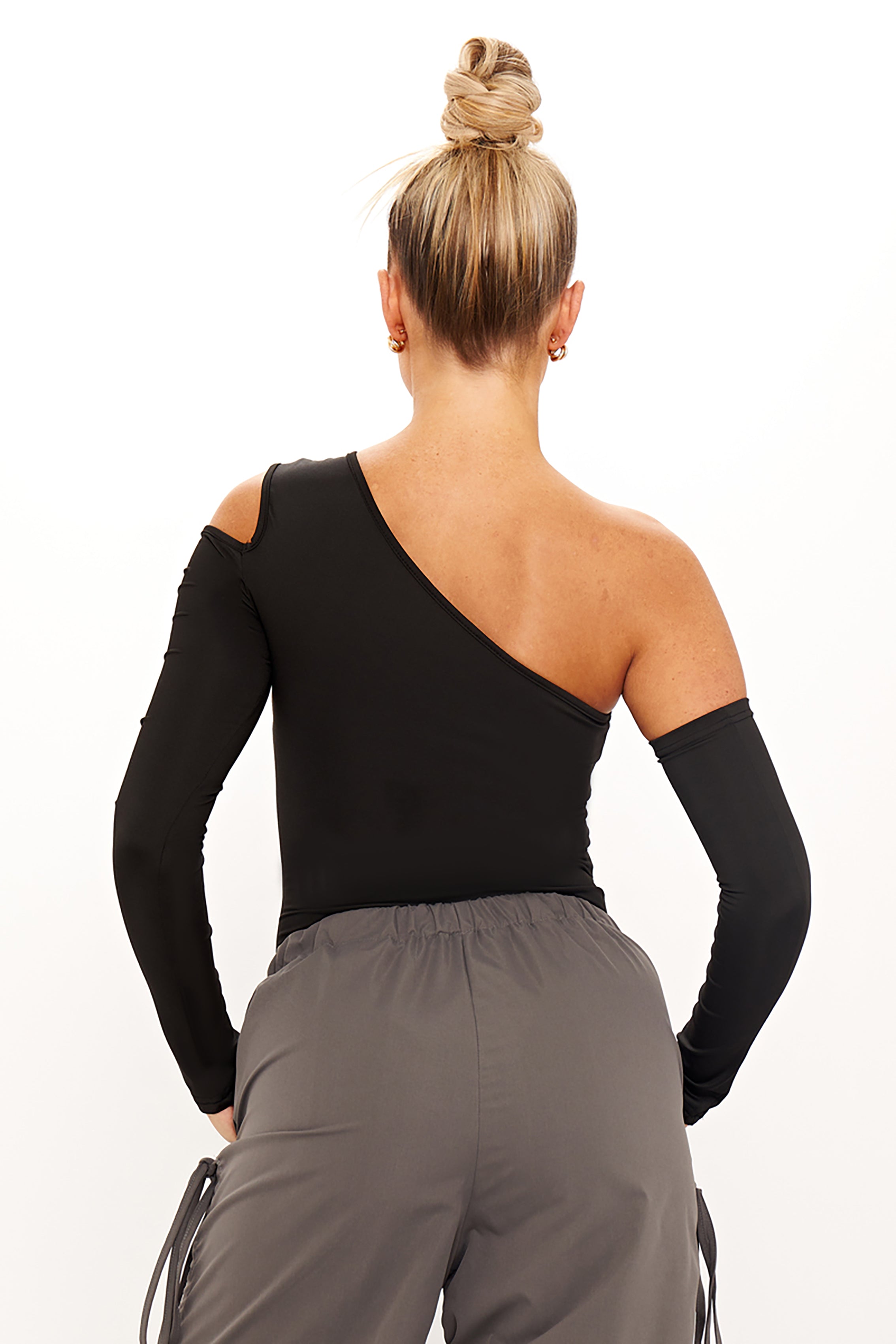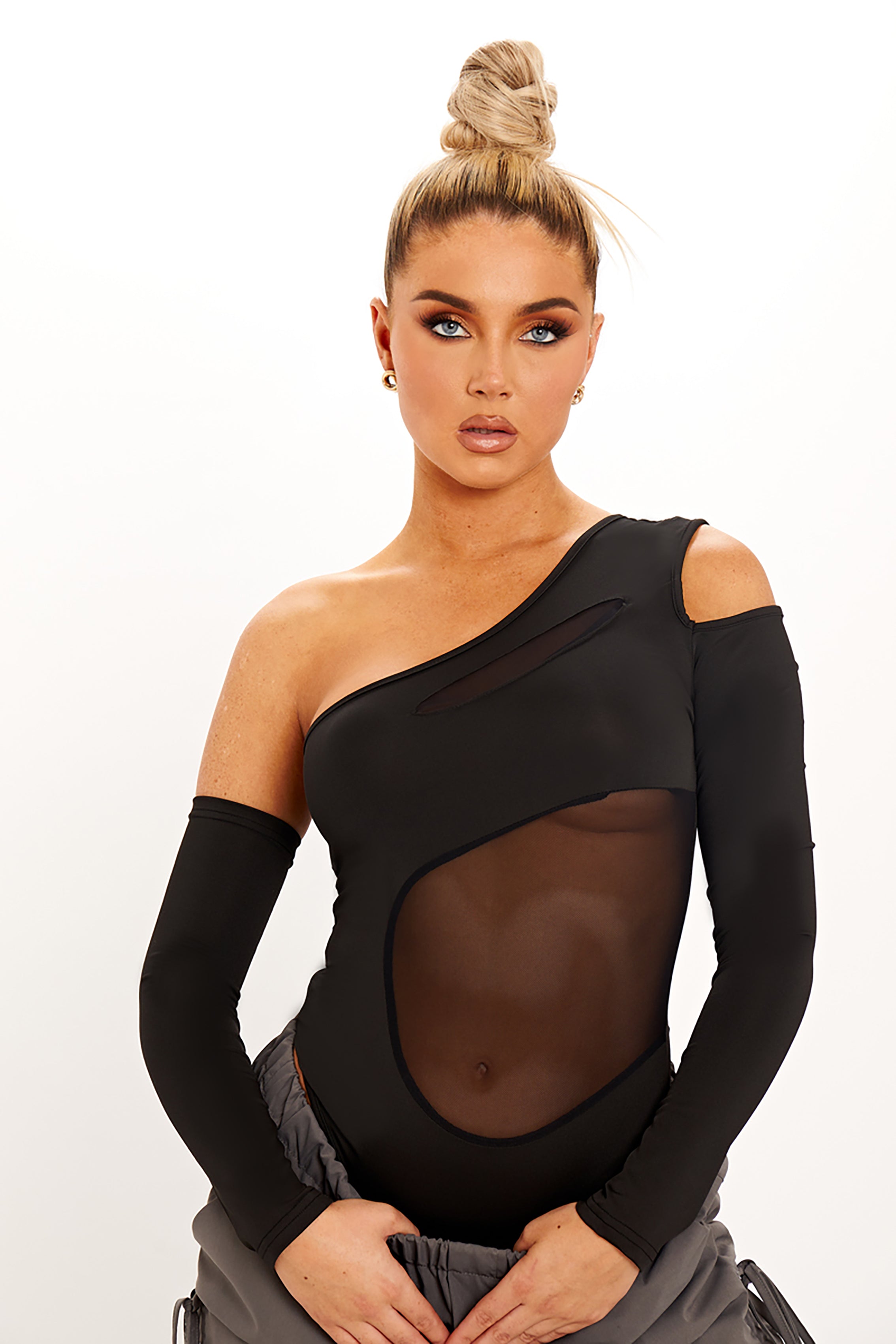 Black One Shoulder Mesh Cut Out Bodysuit with Sleeves