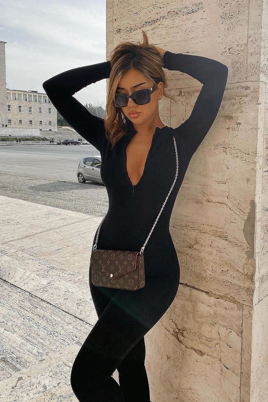 Black Ribbed High Neck Long Sleeve Jumpsuit