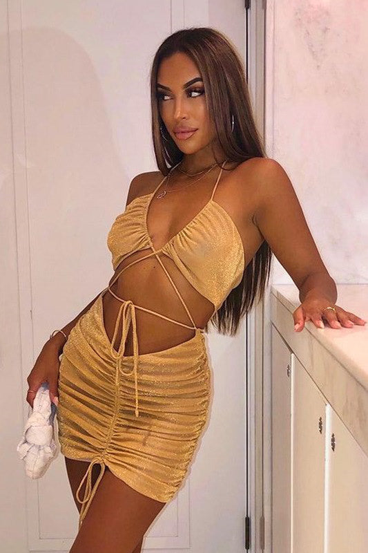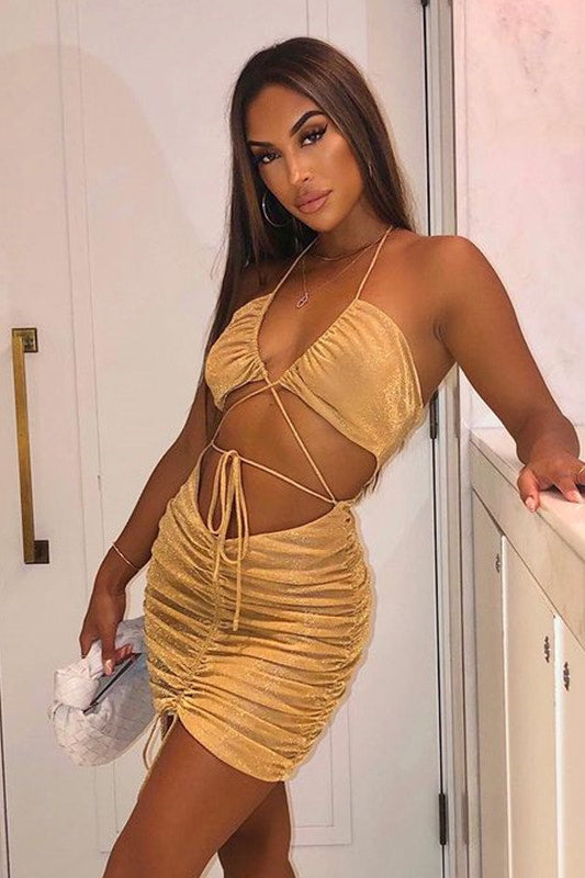 Gold Sparkly Cross Strap Ruched Mini Dress