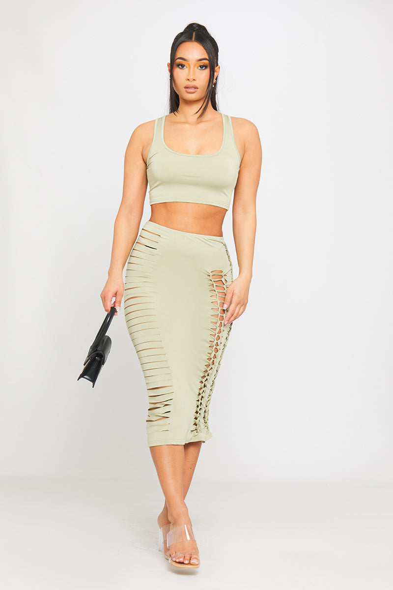 Sage Green Cut Out Braid Detail Crop Top & Midi Skirt Co-Ord